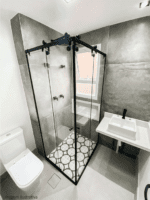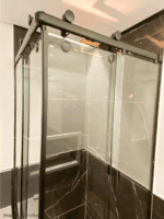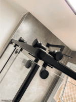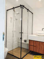 Box para banheiro ENCANTO, na cor PRETO, o ORIGINAL com roldanas aparentes da Ideia Glass para fechamentos de box em “L”.